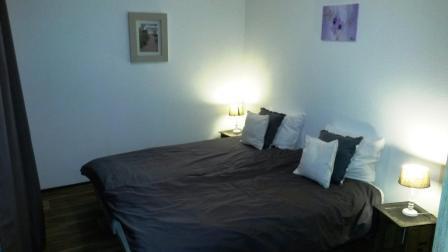 Grote slaapkamer met 2 persoonsbed (ook als 1 persoons te gebruiken). Achter de schuifdeuren(rechts kledingkast, links doorgang) bevindt zich een kleine slaapkamer met kinderbed en nog een slaapmogelijkheid (matras 1.80 x 2.00m)